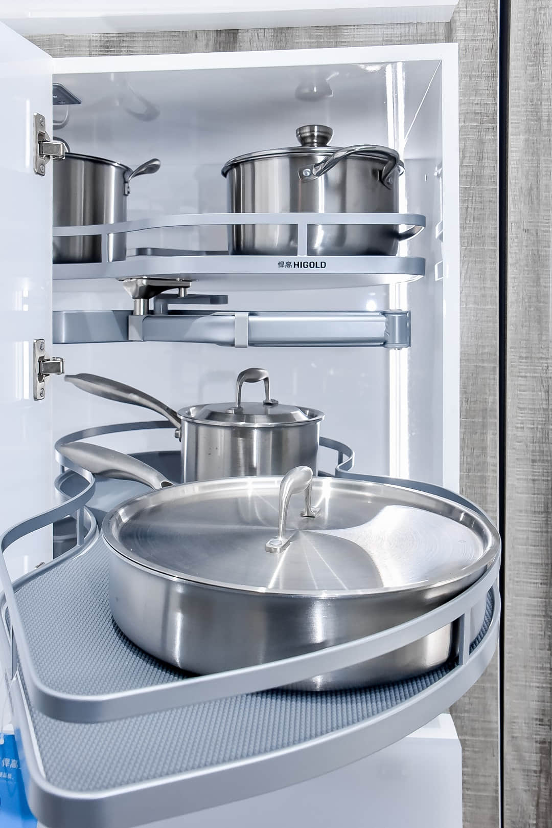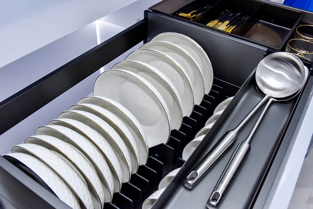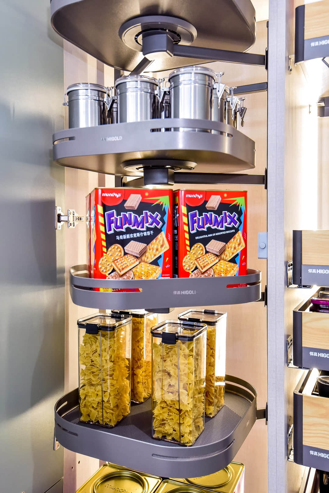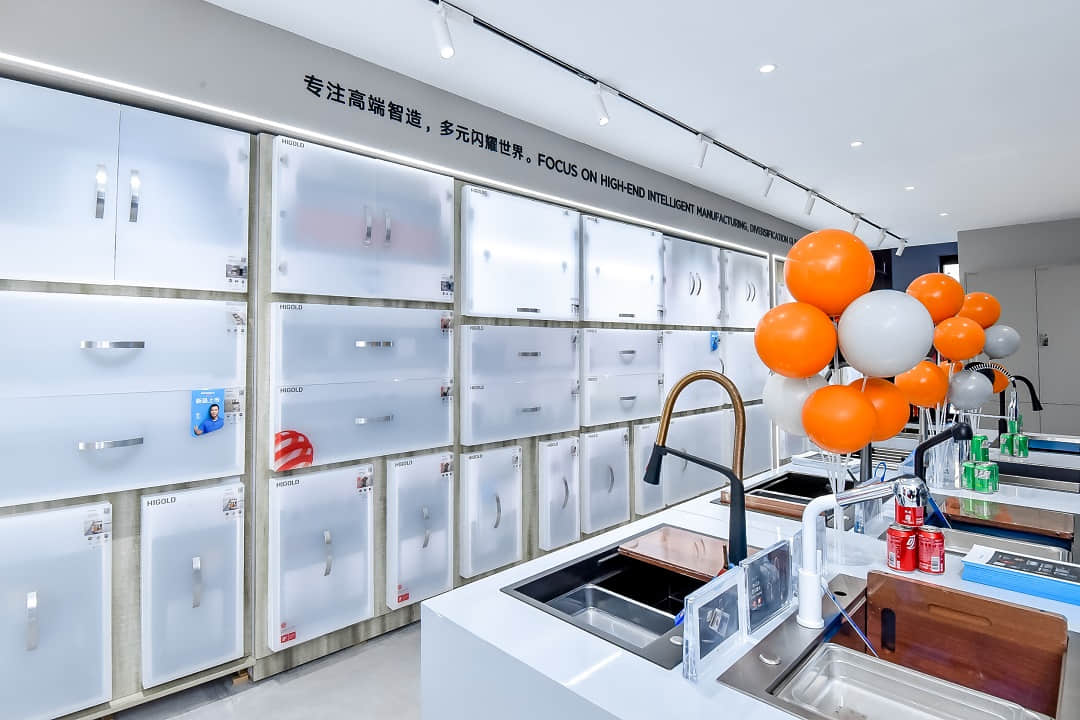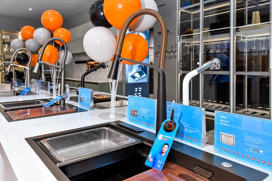 悍高哈尔滨旗舰店展厅空间规划为厨房功能五金、衣柜功能五金、基础五金、水槽龙头、装饰五金、智能厨电、卫浴五金区域,消费者到店即可体验一站式的全屋五金解决方案。